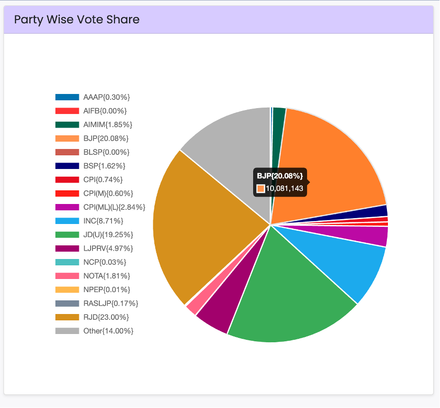 The 2025 Bihar Assembly election results, announced on 14 November 2025, saw the BJP-led NDA coalition secure 202 out of 243 seats. The MGB alliance (comprising Congress, RJD, and other parties) won 35 seats, while other parties claimed 5 seats.