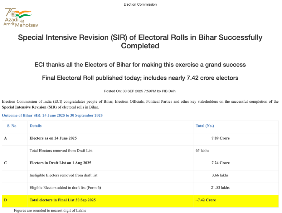 The Election Commission of India carried out a Special Intensive Revision (SIR) to update and refine the voter list for the 2025 Bihar Assembly elections. This process started on 24 June 2025 and concluded with the release of the final revised list on 30 September 2025. As per this list, the Commission identified about 7.42 crore voters in the state.