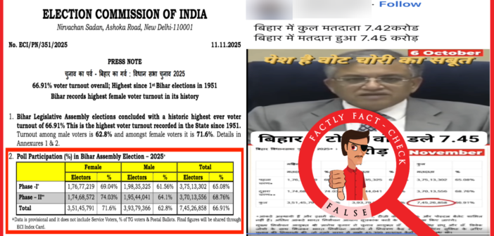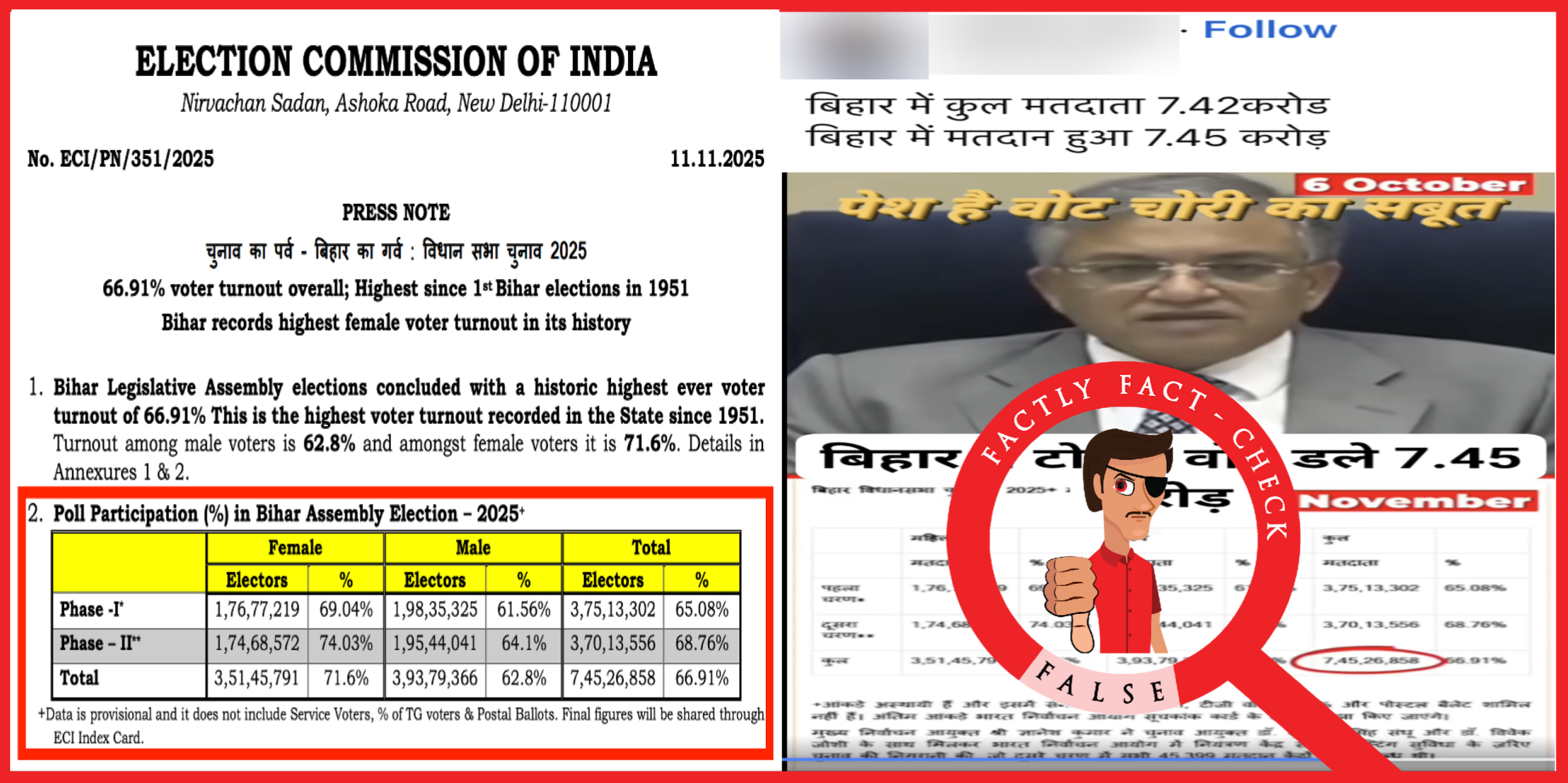 In this context, a widely circulated social media post (here, here, here & here) claims that the voter turnout exceeded 100%, alleging that 7.45 crore votes were cast despite there being only 7.42 crore registered voters for the 2025 Bihar Assembly elections. Let’s verify the claim made in the post.