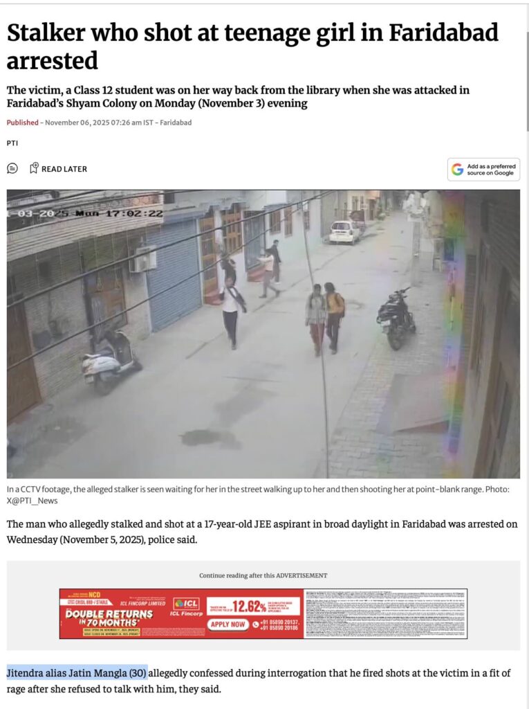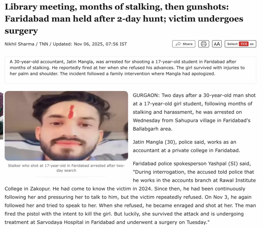 According to news reports (here, here, here, here, and here), Faridabad Police have identified the man who allegedly stalked and shot the 17-year-old girl as Jitendra, alias Jatin Mangla (30), and arrested him on 05 November 2025. Reports further state that during police interrogation, Jatin Mangla confessed that he fired at the victim in a fit of rage after she refused to speak to him. When a Crime Branch team took him to recover the weapon—a country-made pistol used in the attack—the accused allegedly pulled out the pistol, which had been hidden beneath a heap of stones, and opened fire on the police. In response, the police fired back, injuring him in the left leg. Two cases have been registered against Jitendra, alias Jatin Mangla (30): one at the City Ballabgarh police station on 03 November 2025 for attacking and shooting the minor girl, and a second FIR at the Sector 58 police station for attempting to murder police personnel.