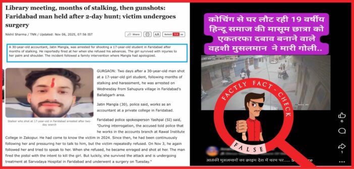 Fact: This viral video shows an incident that took place in Faridabad’s Shyam Colony, under the jurisdiction of the city Ballabhgarh police station, on 03 November 2025. According to police and media reports, the man who stalked and shot at a 17-year-old girl is Jitendra, alias Jatin Mangla. Speaking to Factly, Inspector Shamsher Singh, SHO of the city Ballabhgarh police station, confirmed that both the victim and the accused are Hindu; there is no communal angle in the incident. Hence the claim made in the post is FALSE.