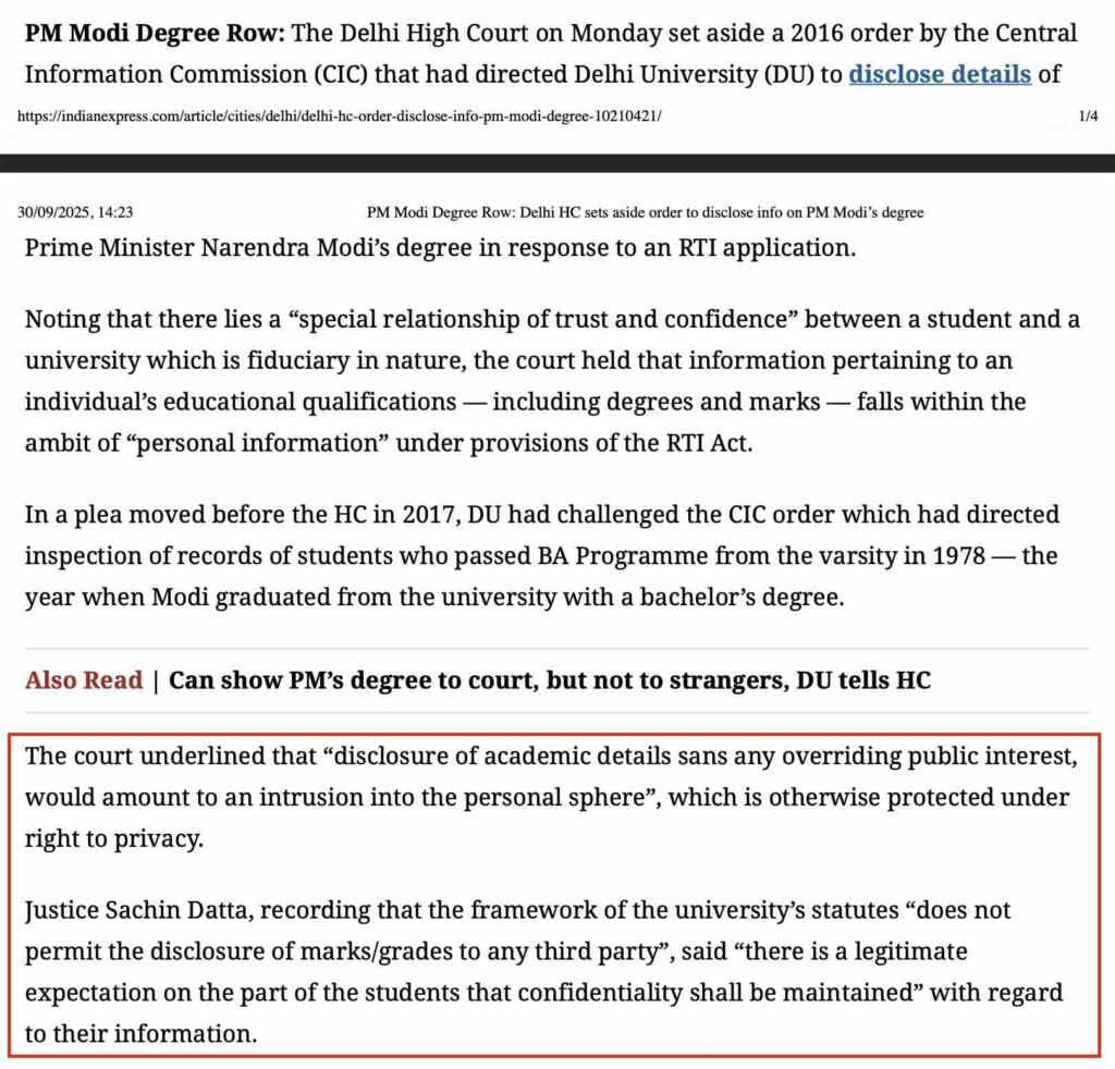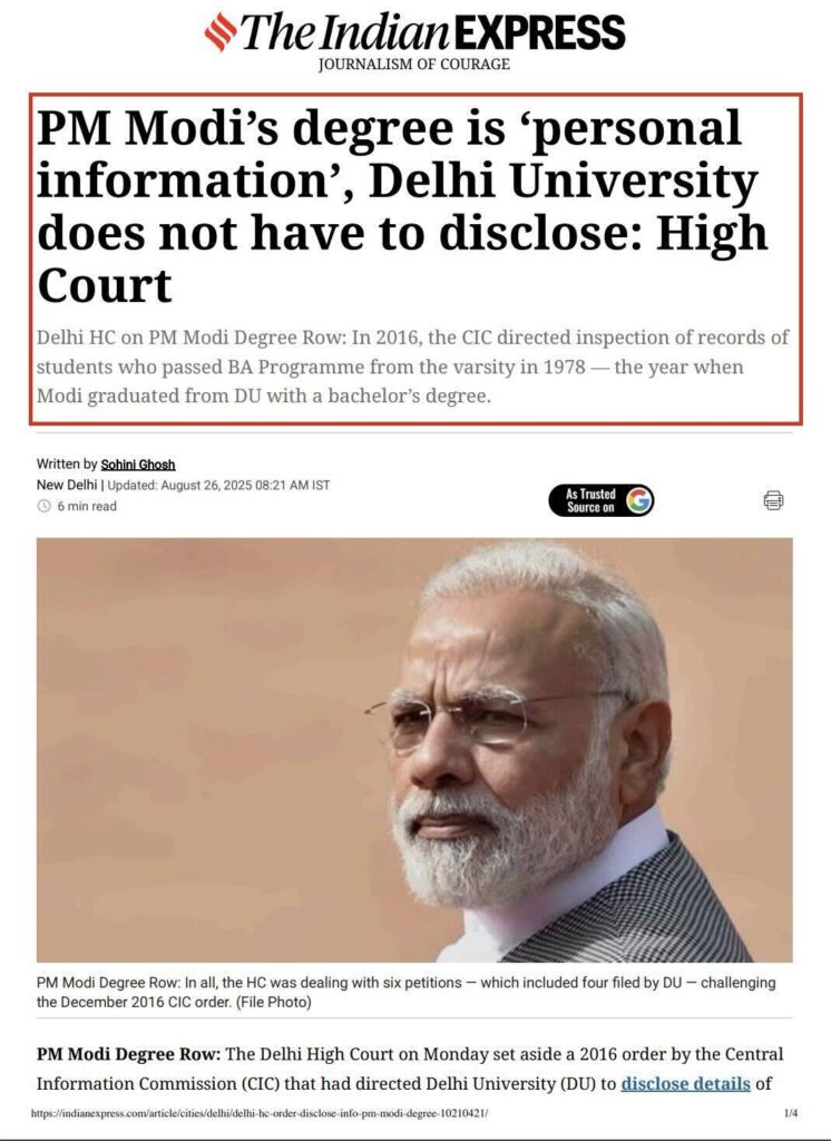 Further, during this search, we found (here, here, here, here and here) that on 25 August 2025, ‘The Delhi High Court set aside a 2016 order of the Central Information Commission (CIC) that had directed the University of Delhi (DU) to disclose and allow inspection of records relating to Prime Minister Narendra Modi’s bachelor’s degree.’