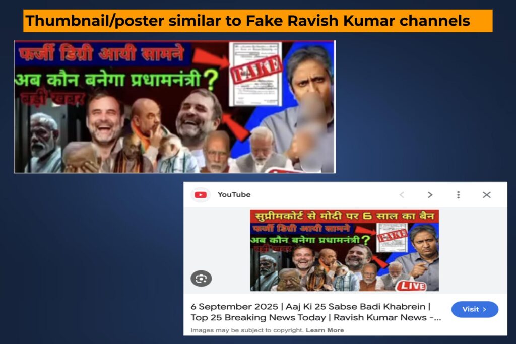 Furthermore, through a reverse image search, we found that the thumbnail/graphic seen in the lower part of the viral video resembles the thumbnails of a few YouTube channels (here and here) that produce fake AI-generated voice-over videos of Ravish Kumar.