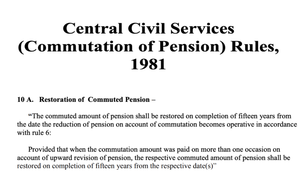 The current rule under the Central Civil Services (Commutation of Pension) Rules, 1981, stipulates the restoration of full pension after 15 years. Official government portals (here, here) confirm restoration after 15 years. As per CCS Rules, 1981 “The commuted amount of pension shall be restored on completion of fifteen years from the date the reduction of pension on account of commutation becomes operative in accordance with rule 6: Provided that when the commutation amount was paid on more than one occasion on account of upward revision of pension, the respective commuted amount of pension shall be restored on completion of fifteen years from the respective date(s).”