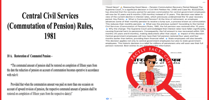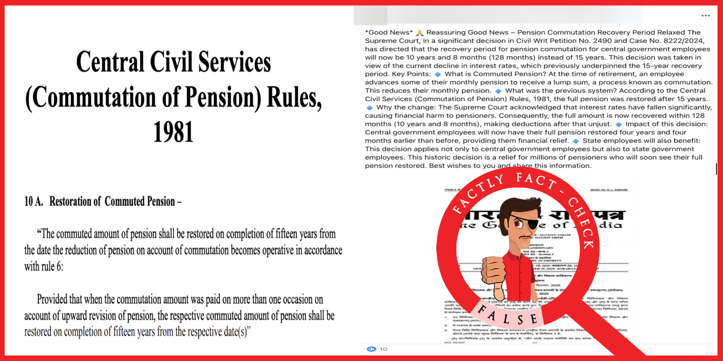 Fact: The Gazette notification graphic accompanying the fake post is unrelated to pension commutation, it is related to the Pension Fund Regulatory and Development Authority (PFRDA). There is no Supreme Court judgment directing that the pension commutation recovery or restoration period for Central Government employees be reduced to 10 years and 8 months (128 months). The cited cases CWP 2490/2024 and 8222/2024 relate to petitions filed in the Punjab and Haryana High Court, not the Supreme Court. As of now, the Central Civil Services (Commutation of Pension) Rules, 1981 continue to apply, which provide for restoration of full pension only after 15 years from the date of commutation. Hence, the claim made in the post is FALSE.