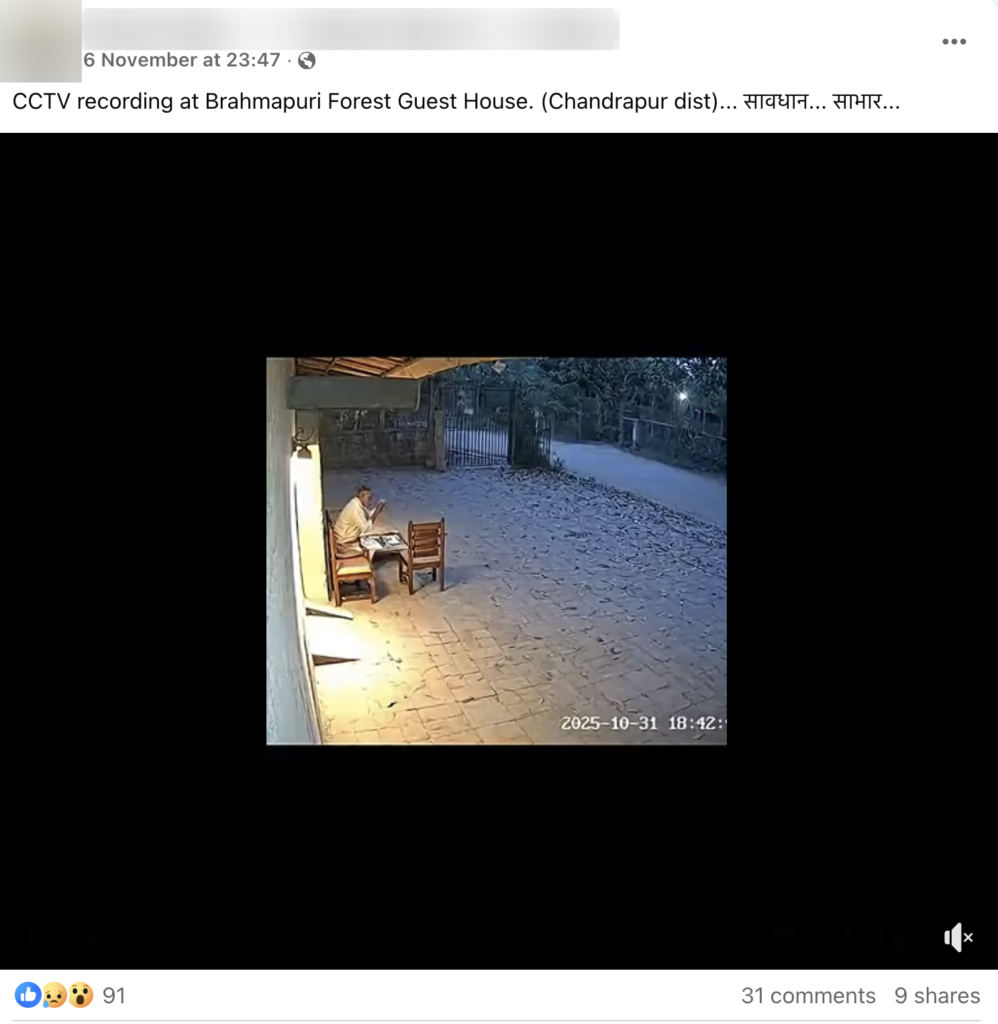 A video claiming to show CCTV footage of a tiger attacking a man at the Brahmapuri Forest Guest House in Chandrapur district, Maharashtra, is being shared on social media (here, here, and here). The video shows a man sitting outside when a tiger suddenly appears and drags him away. Let’s verify the claim made in the post.
