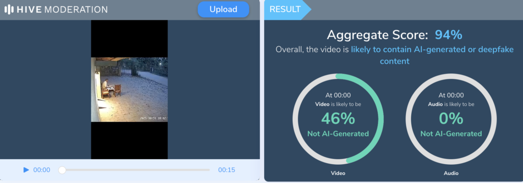 Furthermore, we analysed the video using Hive Moderation, an AI content detection tool, which indicated that the footage was 94% likely to be AI-generated.