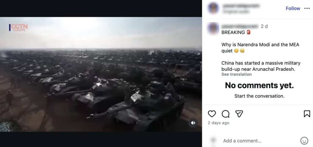A video showing a large-scale military exercise involving tanks, armoured vehicles, soldiers, and robotic units is going viral on social media (here, here, and here). The video is being shared with the claim that it shows China’s massive military buildup near Arunachal Pradesh. Let’s verify the claim made in the post in this article.