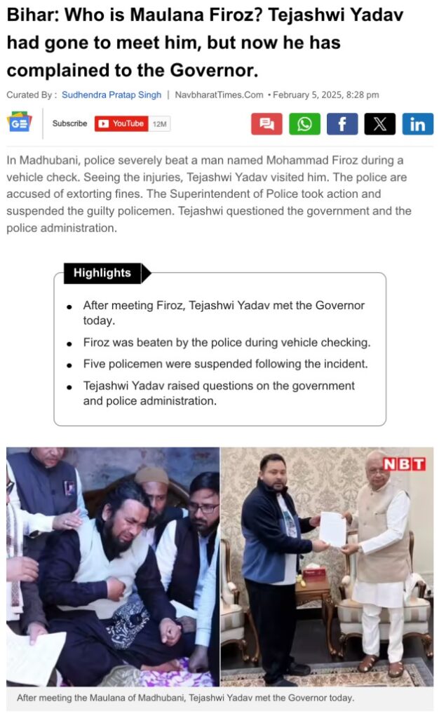 We then did a Google keyword search using relevant terms and found several news reports about the incident. According to these reports (here, here, and here), on 30 January 2025, Mohammad Firoz, a resident of Kataiya village in the Benipatti police station area of Madhubani who served as an imam at a mosque, alleged that some policemen assaulted him during a vehicle check, leaving him with multiple injuries. The police, however, stated that Firoz tried to flee during the check, and while apprehending him, force was used, causing his bike to skid. He fell and was dragged for some distance. Following an investigation ordered by the Superintendent of Police, five policemen were suspended with immediate effect. After the incident, RJD leader Tejashwi Yadav visited Firoz on 03 February 2025, during which Firoz told him that the torture had driven him to contemplate suicide. This confirms that the video is from Bihar and is unrelated to Uttar Pradesh.