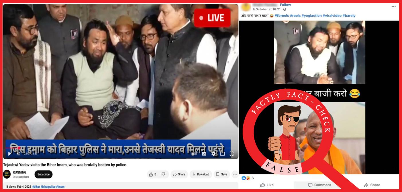 Fact: The viral video is from Bihar, not Uttar Pradesh. It shows Mohammad Firoz, an imam from Kataiya village in Madhubani, narrating his ordeal to RJD leader Tejashwi Yadav. Firoz was allegedly assaulted by police during a vehicle check on 30 January 2025, which left him with multiple injuries; police stated he tried to flee, causing a fall and being dragged for some distance. Five policemen were suspended following an investigation, and Tejashwi Yadav later visited Firoz, who said the torture had driven him to contemplate suicide. Hence, the claim made in the post is FALSE.