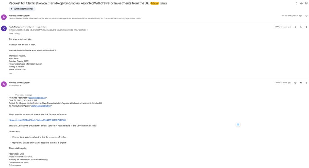 To verify the claim, we also contacted the Government of India’s Press Information Bureau (PIB) for clarification. In response to our email regarding the viral claim, PIB called it fake and shared an X post dated 31 October 2025. The post stated that the claim that India has pulled £500 billion from the UK economy is false and clarified that the Government of India has taken no such decision, advising users to verify information through official sources.
