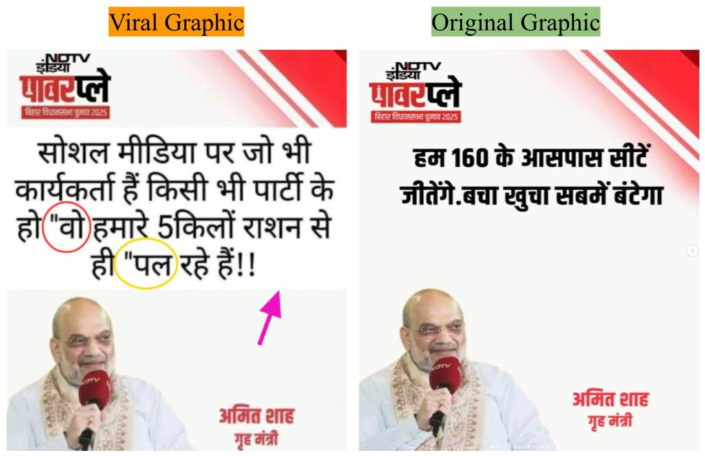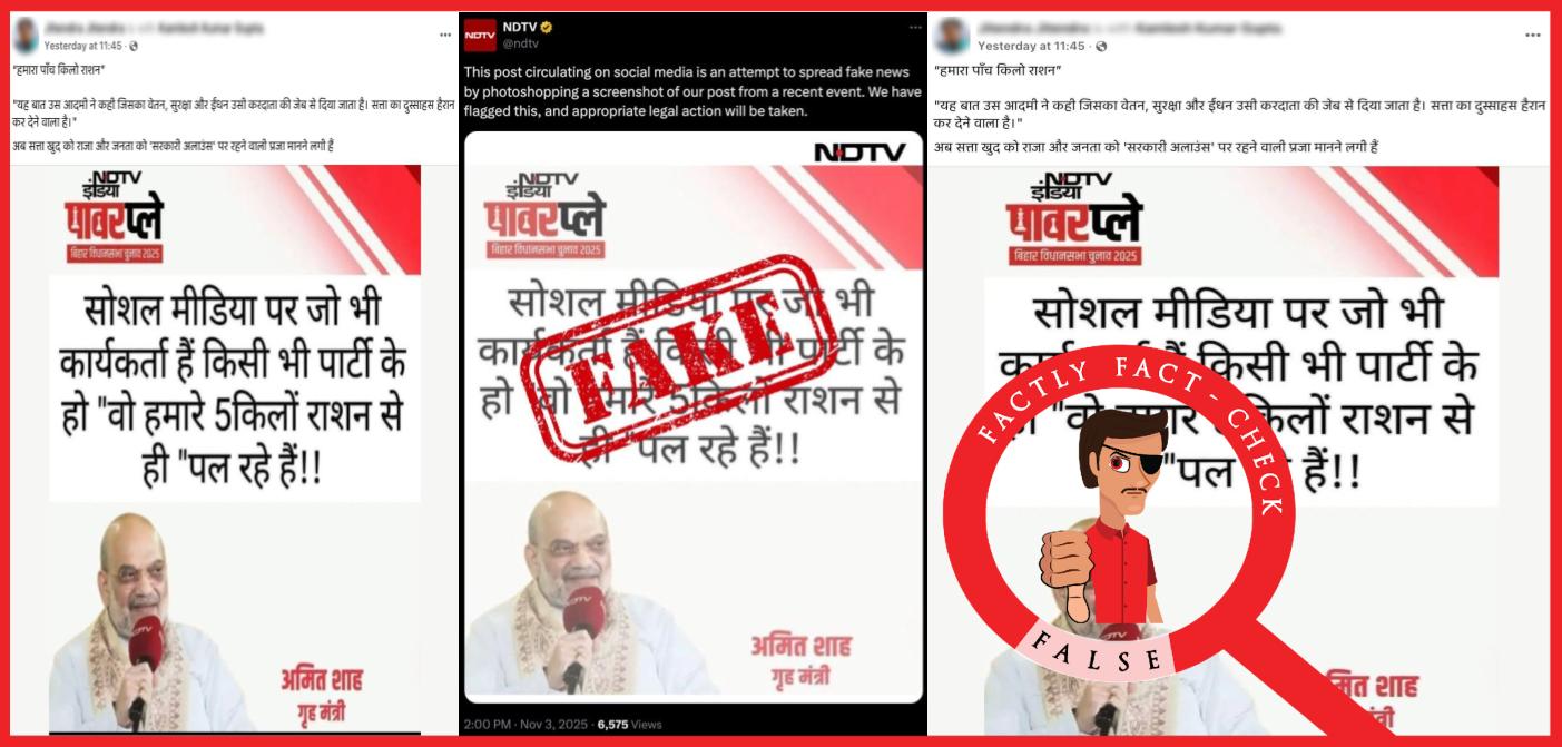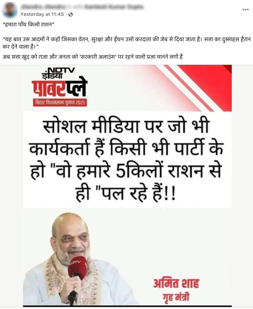 The Election Commission of India (ECI) has officially announced the schedule for the 2025 Bihar Assembly elections, and campaigning by all political parties is now underway. Amid this, a purported NDTV news card, allegedly quoting Home Minister Amit Shah, is circulating widely on social media (here, here, and here), claiming that party workers active on social media are surviving on the 5 kg ration provided by the government. Let’s verify the claim made in the post in this article.