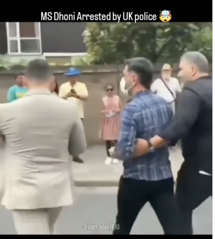 A video is going viral on social media showing a few people walking alongside Indian cricketer Mahendra Singh Dhoni, holding him by the arms as they escort him across a street. The clip is being shared with the claim that Dhoni has been arrested in the UK. Let’s verify the truth behind this claim.