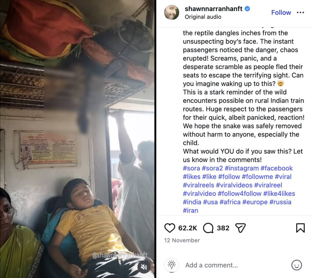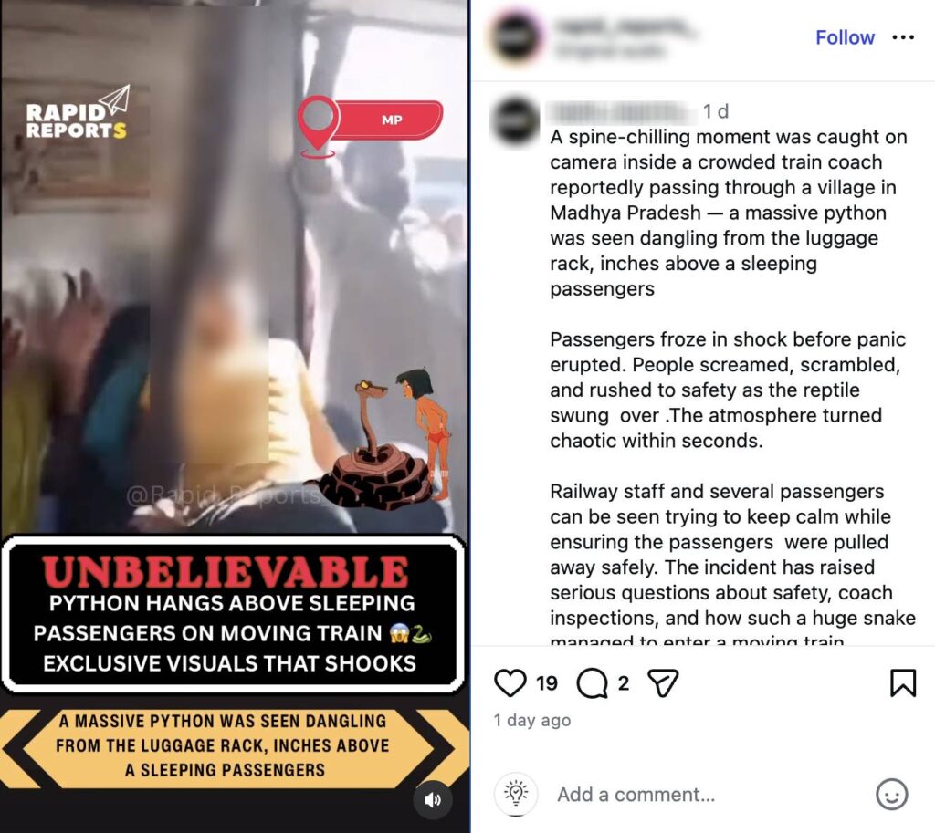 Fact: The viral video does not show a real incident of a massive python in a crowded Madhya Pradesh train causing panic; It is an AI-generated video. The video was created and uploaded by digital creator Shawn Arranha on his Instagram handle. Analysis using the Hive AI content detection tool gave it a 98.3% likelihood of being AI-generated. Hence, the claim made in the post is FALSE.