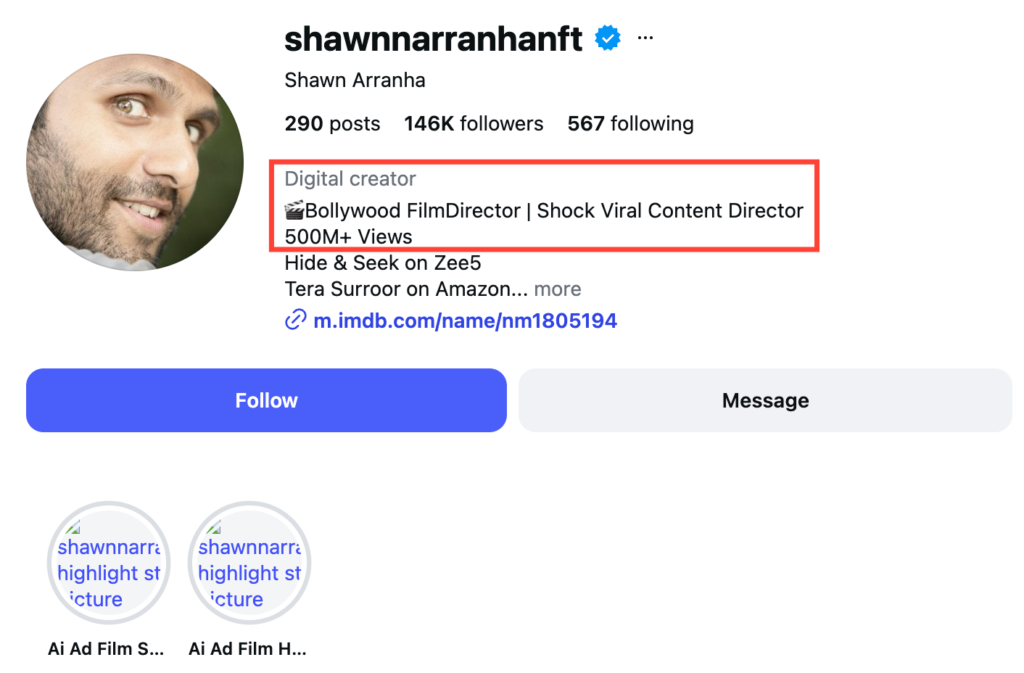 Upon reviewing Shawn Arranha’s profile, we found that he regularly posts AI-generated videos. His bio states that he is a digital creator who makes shocking viral content.