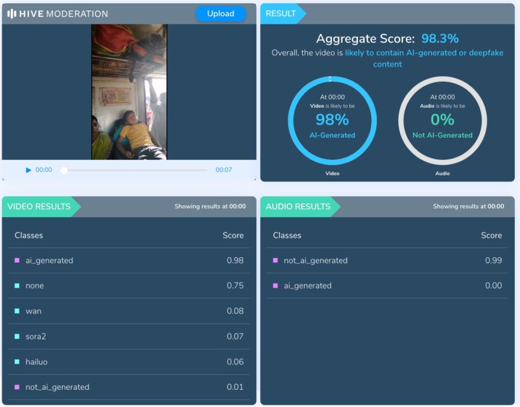To further verify whether the viral video is AI-generated, we analysed it using the Hive AI content detection tool. The tool flagged the video with an aggregate score of 98.3%, indicating that it is likely fake.