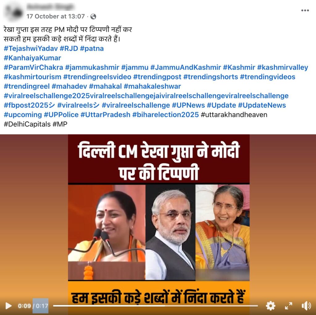 The Election Commission of India (ECI) has officially released the schedule for the 2025 Bihar Assembly elections. Meanwhile, a video of Delhi CM Rekha Gupta is going viral on social media (here, here, and here), where she allegedly says, “Those who cannot manage their own family, how will they manage Bihar? That is why we need to give Bihar’s reins into strong hands.” The post is being shared with claims that she is referring to Prime Minister Modi. Let’s verify the claim made in the post.