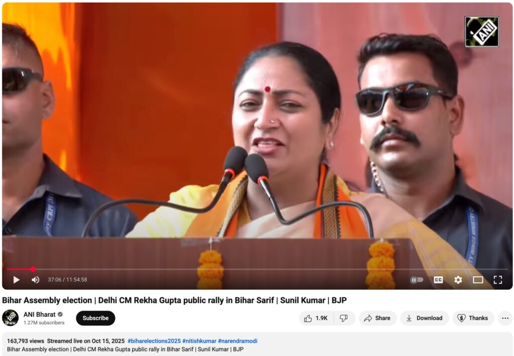 A reverse image search of key frames from the viral video led us to a longer version uploaded on the YouTube channel ANI Bharat on 15 October 2025, titled “Bihar Assembly election | Delhi CM Rekha Gupta public rally in Bihar Sharif | Sunil Kumar | BJP.” The video shows Delhi Chief Minister Rekha Gupta addressing a rally in Bihar Sharif while campaigning for BJP candidate Sunil Kumar as part of the NDA’s election campaign for the 2025 Bihar Assembly polls. The viral portion was taken from the 37:05-minute mark, where Rekha Gupta is seen praising the NDA alliance and the Nitish–Modi duo, while criticising the opposition—apparently referring to the Rashtriya Janata Dal (RJD) party and Lalu Yadav’s family. During her speech, she remarked, “The kerosene in the lantern has now run out. It lacks light. Now is the era of LED lights,” clearly suggesting that her comments were directed at the RJD.