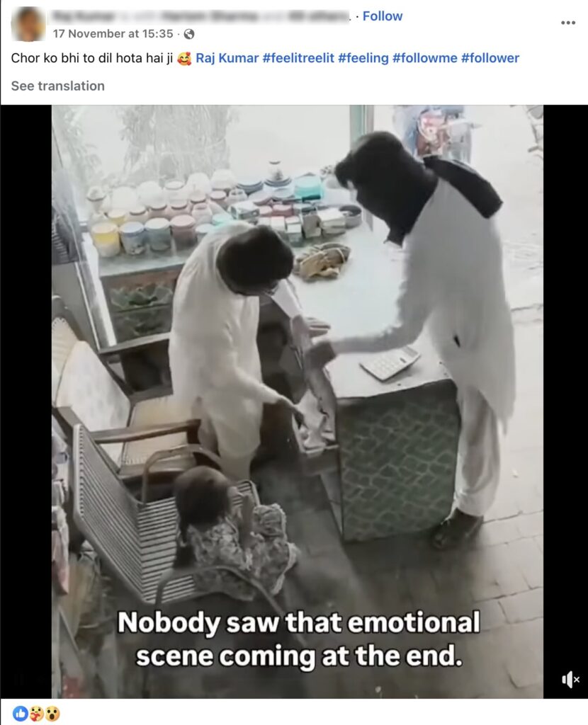 Claim: A CCTV video shows a thief abandoning a robbery and returning the money after a child offers him a lollipop inside the shop.