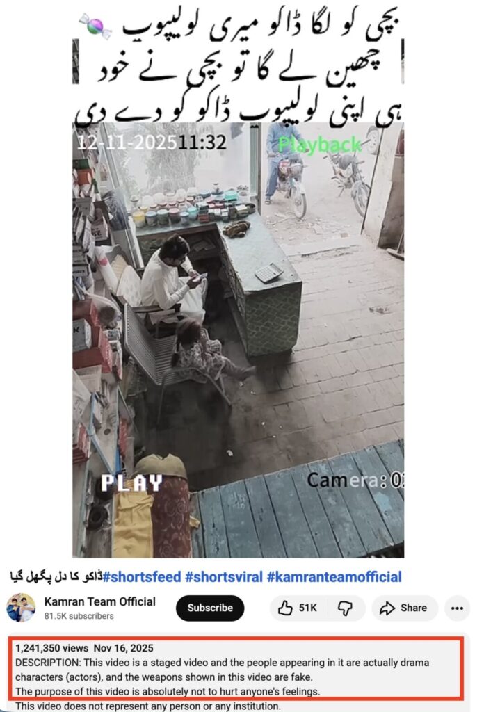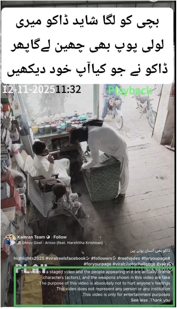 To verify the claim, we performed a reverse image search on Google, which led us to the original video uploaded on the Pakistani YouTube channel Kamran Team Official on 16 November 2025. In the video’s description, it is clearly stated that the clip is scripted, the individuals featured are actors, and the weapons shown are fake.