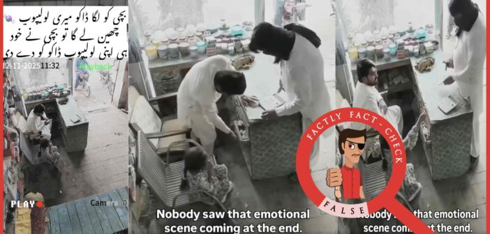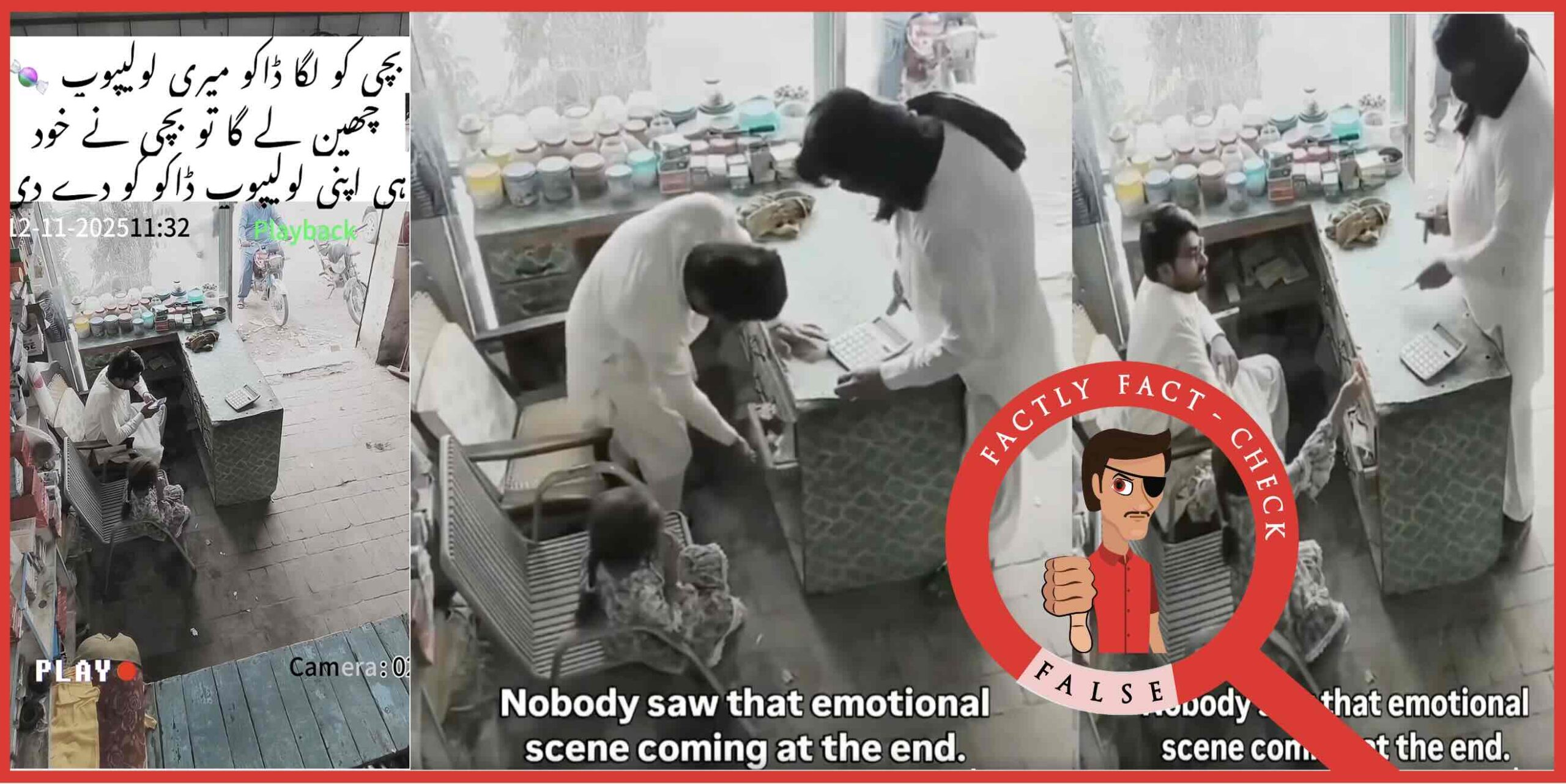 A CCTV video (here, here, here and here) is going viral on social media, showing a thief entering a shop to commit a robbery. While he attempts to steal, a child inside the shop offers him a lollipop, prompting the thief to abandon his plan, return the money, kiss the child, and walk away. This video is being widely shared as a real incident. Let’s find out the truth behind it.