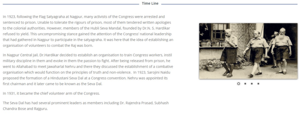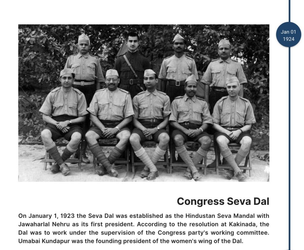 The Seva Dal is a grassroots, frontal organisation of the Indian National Congress (here, here). It was established in 1923 as the Hindustani Seva Dal, with the primary aim of opposing British rule. Members of the Seva Dal received physical training, and by 1931, it had become the chief volunteer wing of the Congress. The Seva Dal uniform resembles the former uniform of the RSS, which included a black cap, khaki shorts, and a stick. Numerous photographs of Pandit Nehru wearing the Seva Dal uniform are available online (here, here).