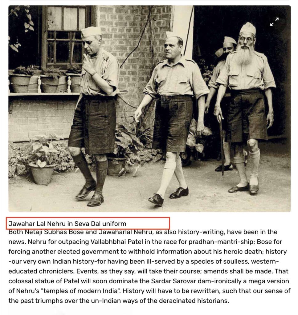 A reverse image search of the second photo revealed that it appeared in an article titled “Shahid Amin Reviews Nehru and Bose: Parallel Lives”, published in ‘India Today’ in 2014. According to the caption of the photo, Jawaharlal Nehru is seen wearing the uniform of the Congress Seva Dal. We also found that the same photo is featured on the website of the Congress Seva Dal.
