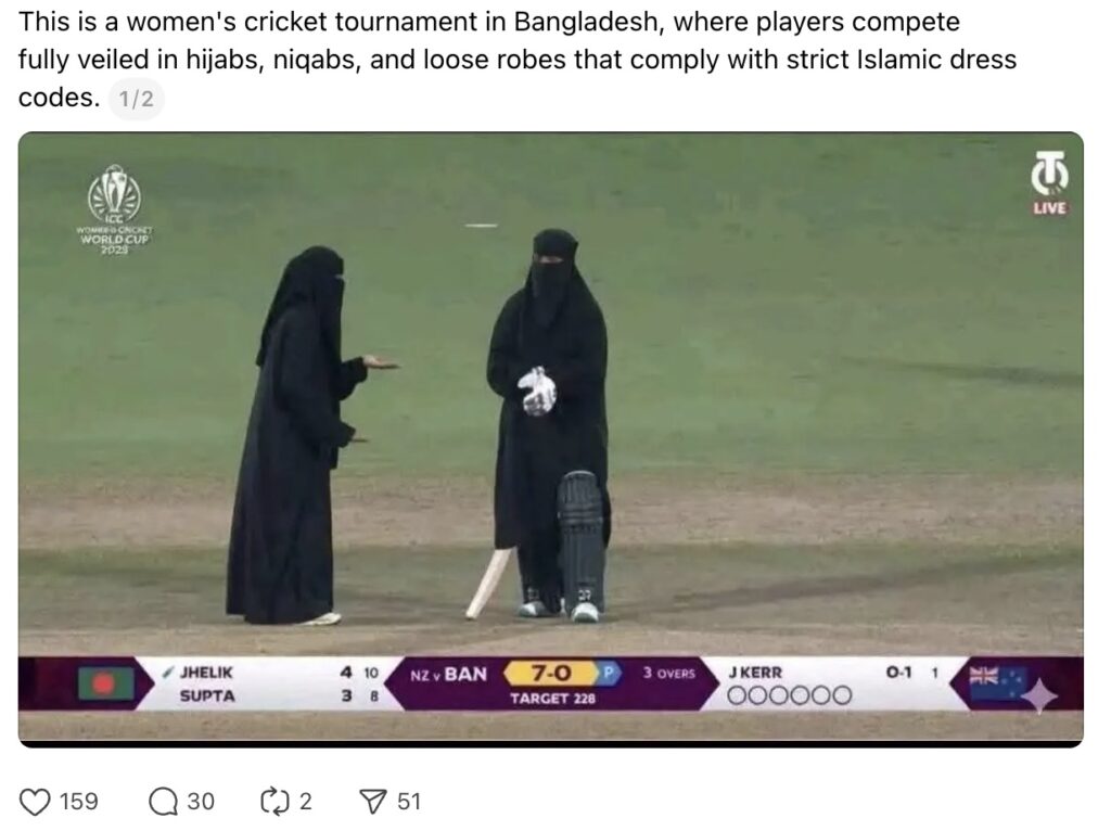 The ICC Women’s World Cup began on 30 September 2025 and will run until 2 November 2025, co-hosted by India and Sri Lanka. As the matches continue, a recent game between New Zealand and Bangladesh ended with New Zealand winning by 100 runs. Amid this, a photo (here, here and here) has gone viral on social media showing two women wearing burqas on a cricket field, with claims that Bangladeshi women players are competing in burqas. Let’s find the truth behind this photo.