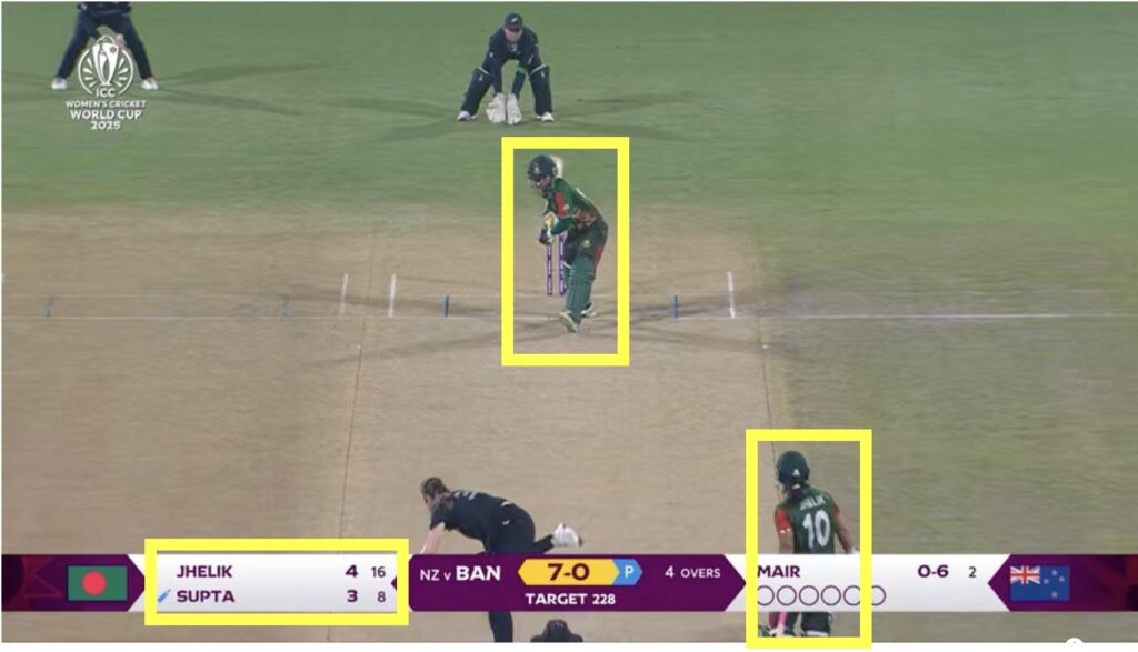 In the viral photo, the scoreboard at the bottom displays the names “Jhelik” and “Supta.” During the actual match, both players had a partnership of 7 runs before Supta was dismissed. Upon reviewing the footage, we confirmed that both players were wearing the official Bangladeshi jersey, not burqas.
