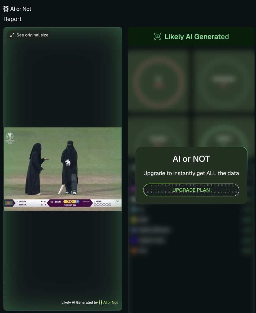To determine whether the image was AI-generated, we ran it through an AI detector called AI or Not, which clearly indicated that the image is likely AI-generated. These pieces of evidence confirm that Bangladeshi players did not play wearing burqas or hijabs, the viral image is AI-generated and not real.