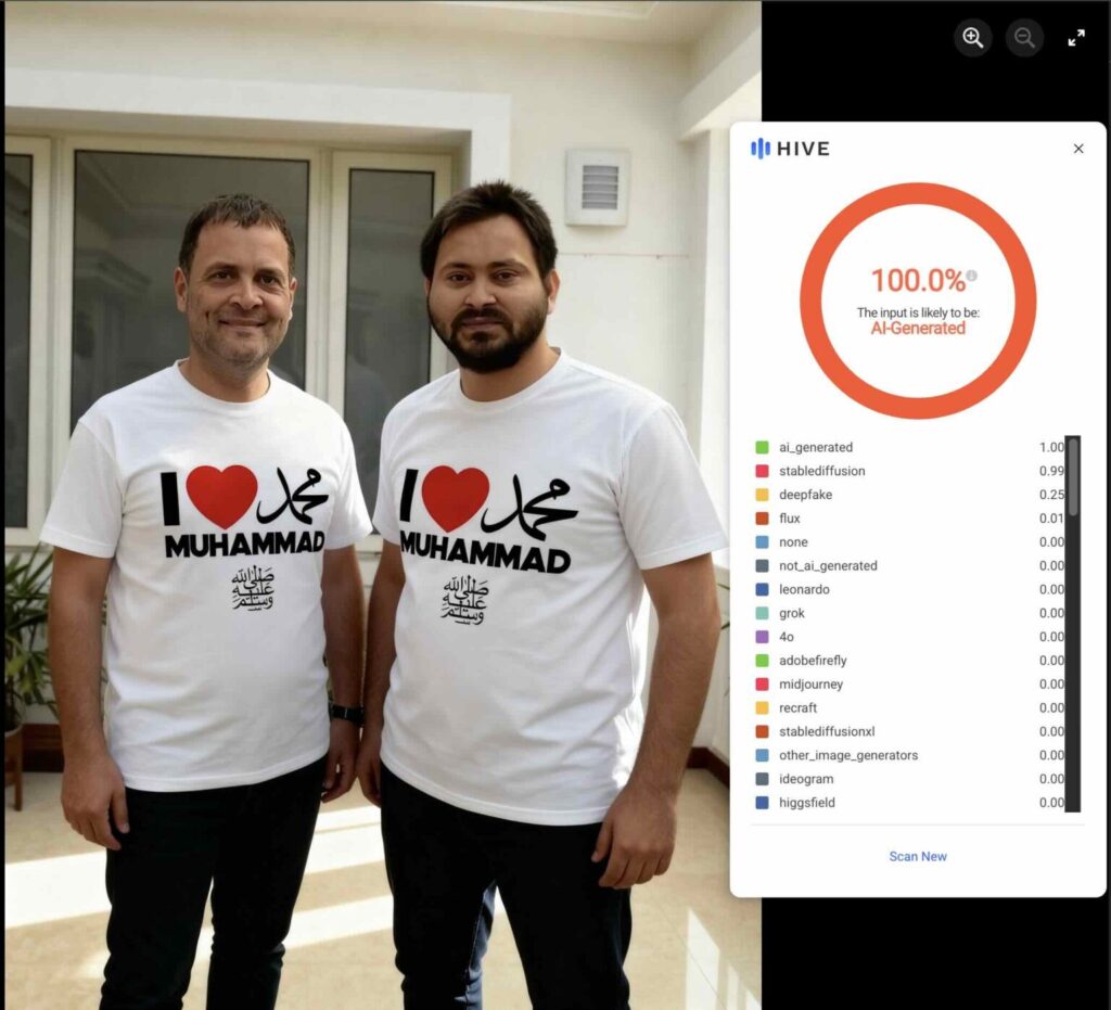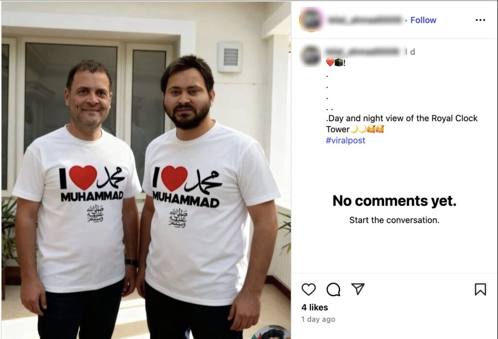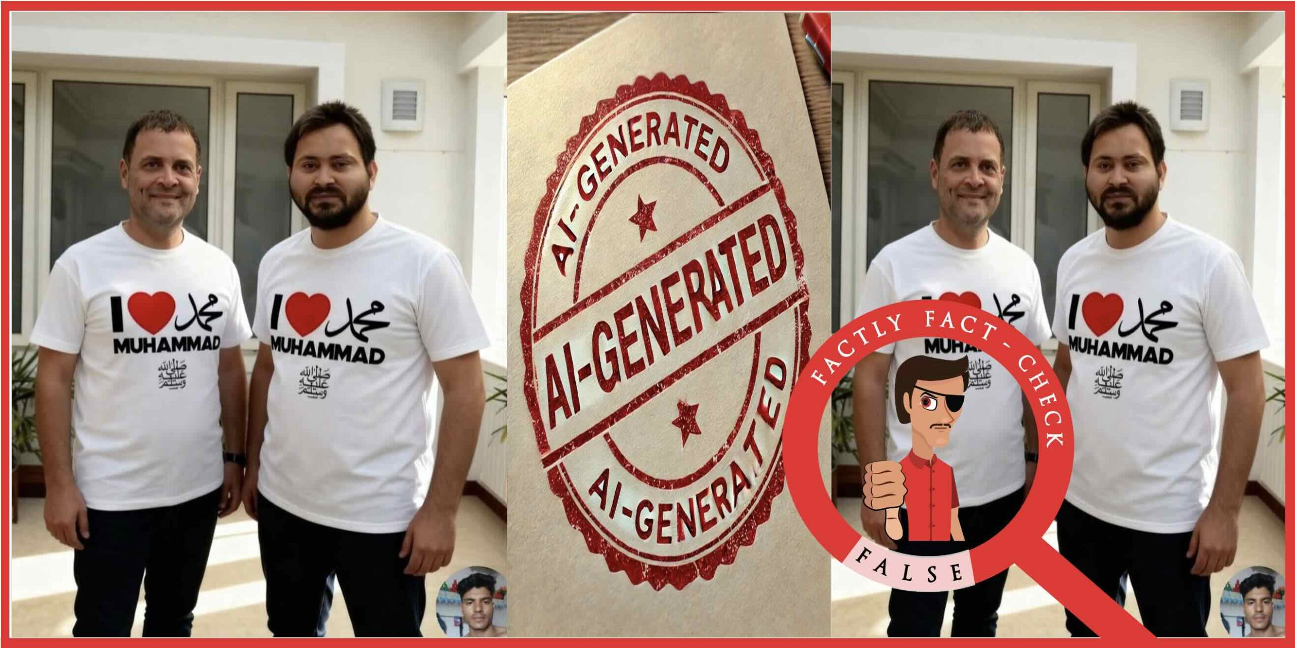 To sum up, this photo of Rahul Gandhi and Tejashwi Yadav wearing ‘I Love Muhammad’ T-shirts is AI-generated .