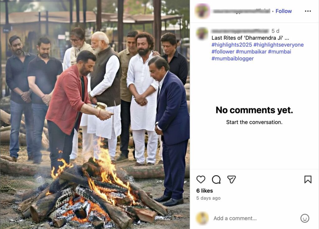 To sum up, the photo showing PM Modi and Mukesh Ambani attending Dharmendra’s funeral is AI-generated.