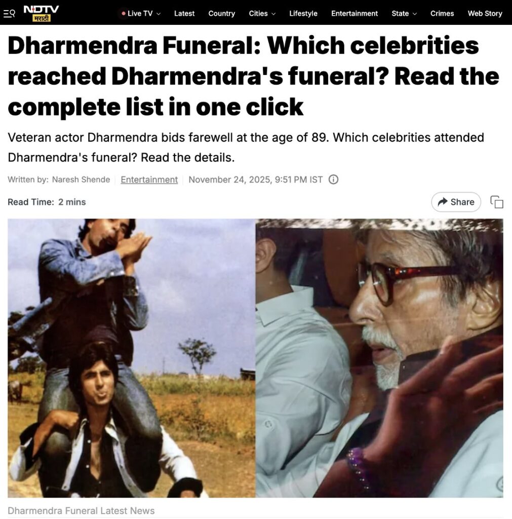 To find the truth behind this claim, we conducted a keyword search to check whether Prime Minister Narendra Modi attended Dharmendra’s funeral. We found no credible reports confirming his presence except for a condolence message posted by PM Modi on Dharmendra’s passing. Likewise, our search to verify whether Mukesh Ambani attended the funeral also did not yield any credible reports.