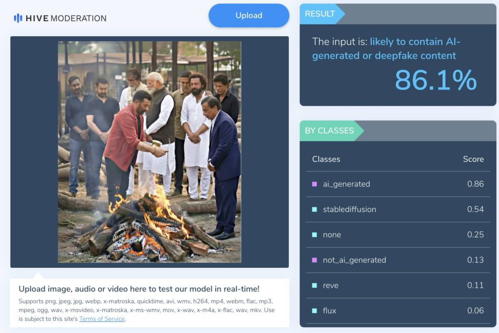 To verify whether the photo was AI-generated, we ran it through Hive, the AI detection tool. The analysis showed an 86% likelihood that the image is AI-generated, confirming that the viral photo is not real.
