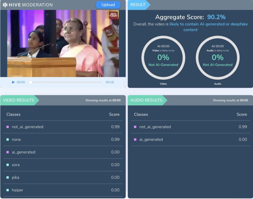 Further, to verify whether the video was a deepfake, we analysed it using the AI detection tool Hive Moderation. The results indicated a 90.2% likelihood of the clip being AI-generated, confirming that the viral video is indeed a deepfake.