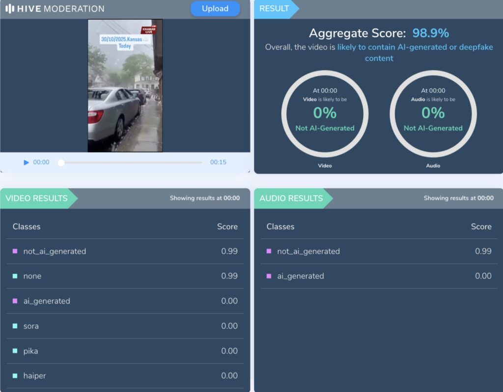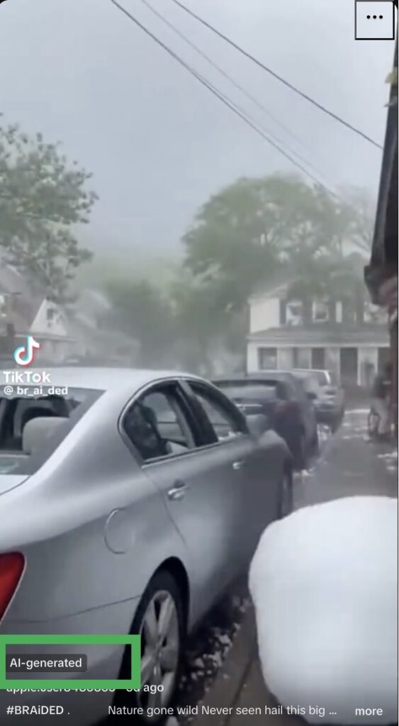Fact: The video is AI-generated. TikTok labelled the same video as AI-generated content, and an AI detection tool, Hive, confirmed that it is 98.9% likely to be AI-generated. Additionally, no credible reports or news of such a hailstorm in Canada or Kansas were found. Hence, the claim is FALSE.
