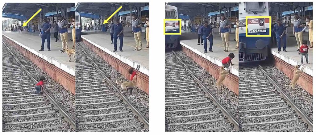 A video (here, here, here and here) has gone viral on social media showing a child standing on a railway track as a train approaches. In the clip, a dog jumps onto the track and appears to help the child climb back onto the platform. Let’s find out the truth behind this video.
