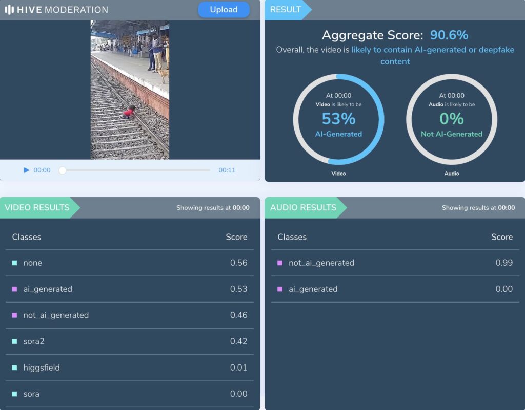 To verify whether the video was AI-generated, we ran it through the AI detection tool Hive, which indicated that the video is 90.6% likely to be AI-generated (Archived link). These findings confirm that the viral video is not real but artificially created using AI.