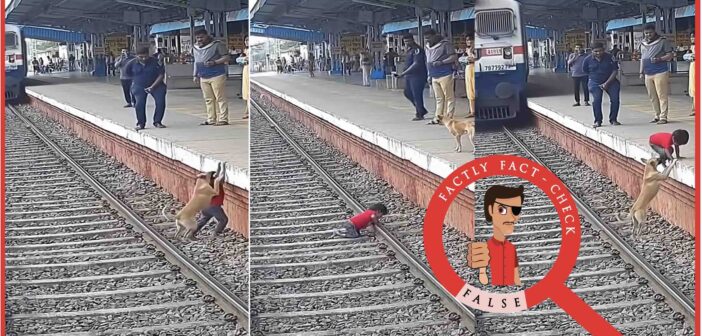 A video (here, here, here and here) has gone viral on social media showing a child standing on a railway track as a train approaches. In the clip, a dog jumps onto the track and appears to help the child climb back onto the platform. Let’s find out the truth behind this video.