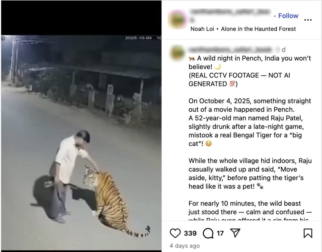 A video (here, here and here) showing an allegedly drunk man fearlessly petting a tiger in the middle of a road is going viral on social media. The clip is being shared with the claim that the incident took place in Madhya Pradesh’s Pench area, known for its tiger reserve, and that the man, identified as Raju Patel, mistook the tiger for a cat while under the influence of liquor. The accompanying caption claims he even tried to make the tiger drink alcohol before walking away unharmed. Let’s find the truth behind this claim.
