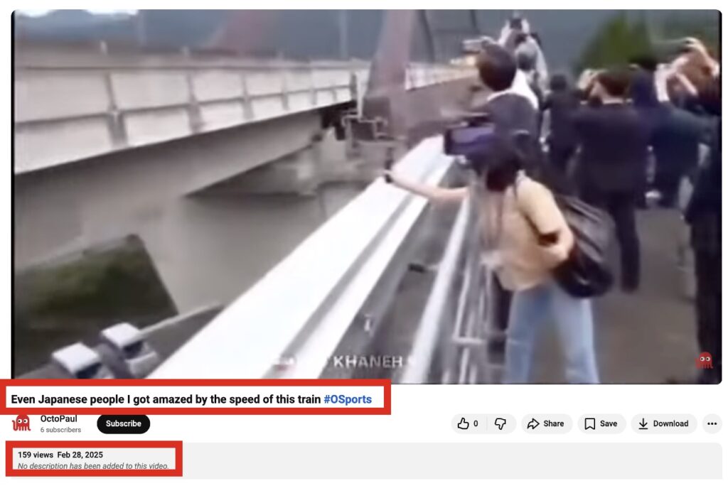 Further keyword searches led us to an extended version of the same video published on the Nippon Television Railway Department’s YouTube channel on 9 November 2024. The footage shows a test run of a 500 km/h Maglev train in Japan.