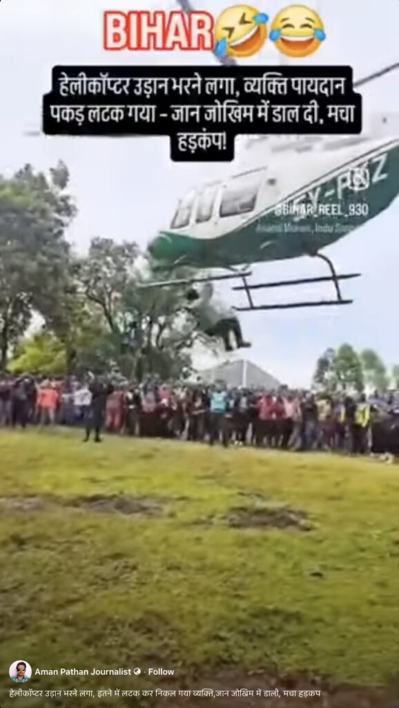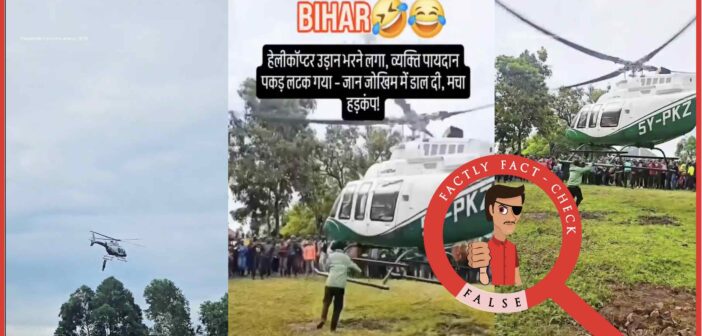 A video (here, here and here) going viral on social media shows a man hanging from a helicopter as it takes off and moves into the air. It is being claimed that the incident took place in Bihar. Let’s find out the truth behind this video.