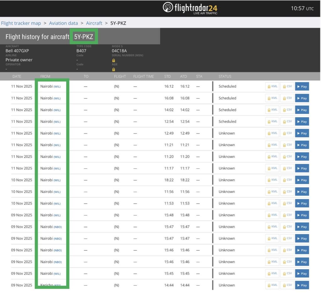 Additionally, when we reviewed the recent flight activity of 5Y-PKZ on the website Flightradar24, all its recent operations were recorded in Nairobi, Kenya, confirming that the helicopter is based there.