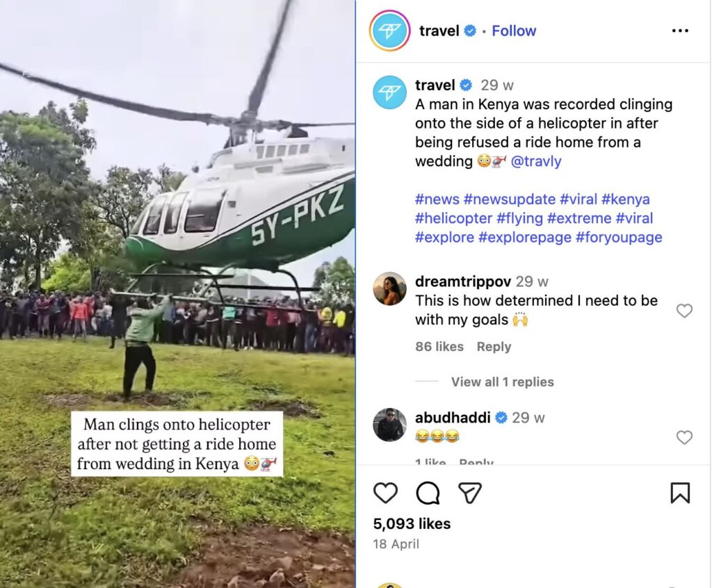 Then, we performed a reverse image search on Google, which led us to the same video uploaded by a popular travel-themed Instagram handle named “Travel.” The extended version of the video shows several African individuals, confirming the location. The post, dated 18 April 2025, was captioned, “A man in Kenya was recorded clinging onto the side of a helicopter after being refused a ride home from a wedding.”