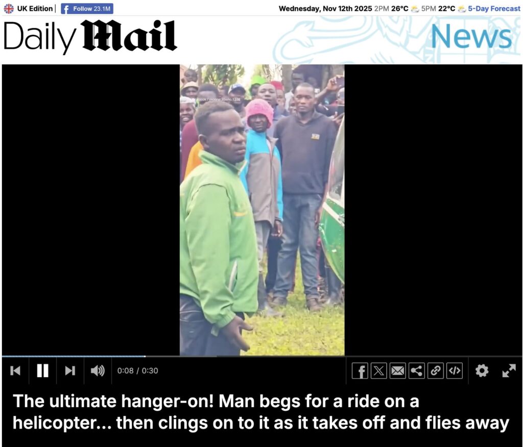 Further search led us to several reports about this incident (here, here and here). According to the Daily Mail, a man identified as Stephen Odhiambo Ouma was filmed clinging to a helicopter during takeoff from a wedding in Rapogi village, Kenya, after being denied a ride. The pilot made an emergency landing soon after noticing him hanging mid-air. Ouma, though exhausted, described the experience as “exhilarating” and claimed he could have completed the 65-minute journey to Nairobi.