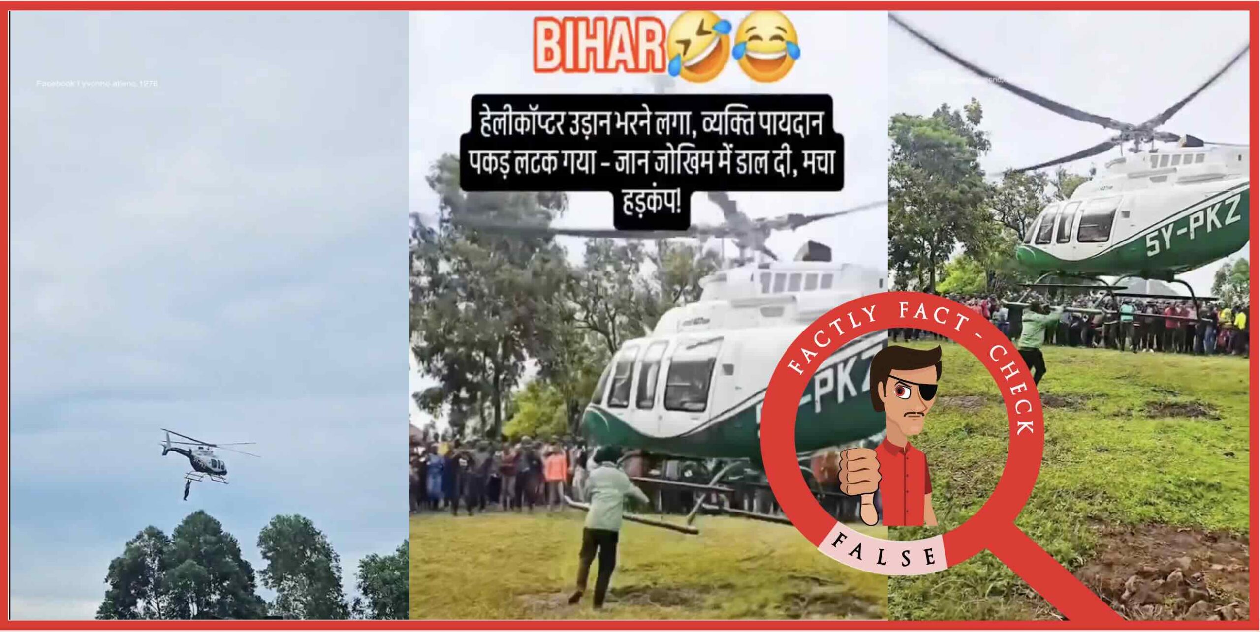 Fact: The video is from Kenya, not Bihar. It shows a man named Stephen Odhiambo Ouma clinging to a helicopter after being denied a ride at a wedding in Rapogi village. The pilot later made an emergency landing, and no such incident occurred in Bihar. Hence the claim is FALSE.
