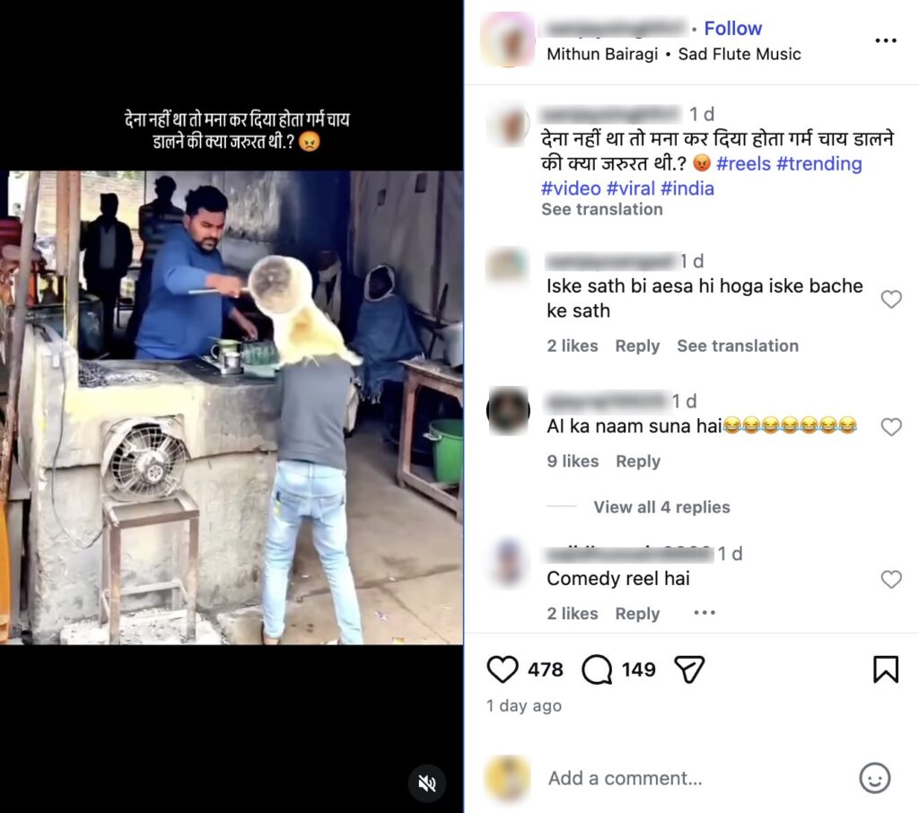 We also found that the same boy seen in the viral video appears in multiple other videos on the same account, where similar “tea pouring” skits are performed on him (here, here and here). This further confirms that the viral video is an act and not a real incident.