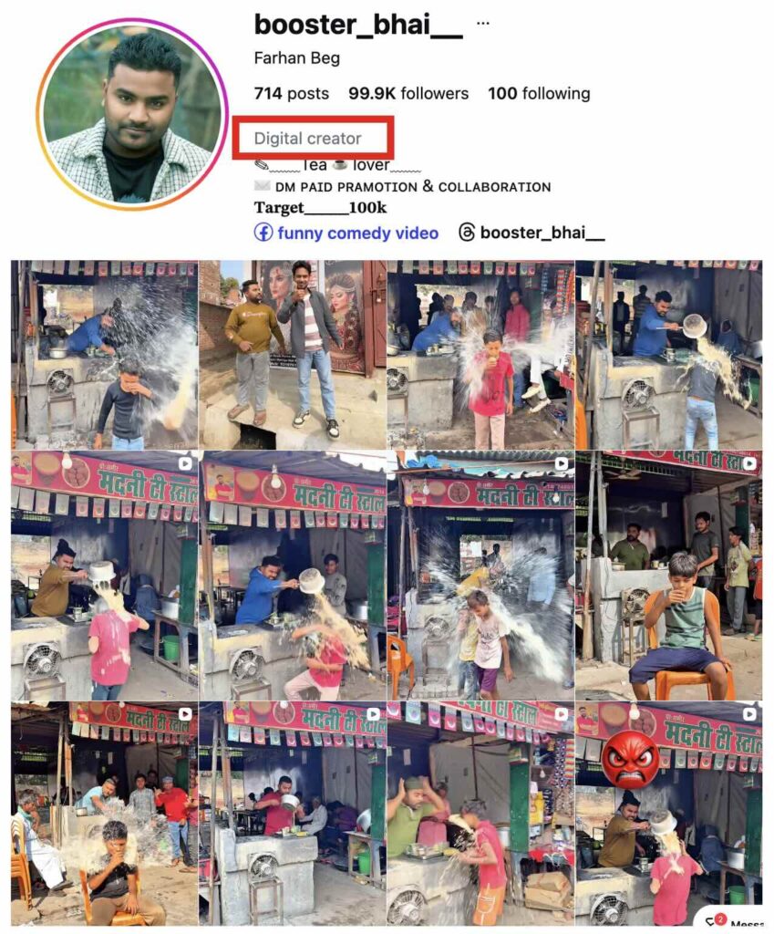 While reviewing the booster_bhai profile, we observed that he identifies as a digital creator and regularly posts similar staged videos involving tea being poured on boys. This indicates that the viral clip is scripted (here, here, here and here).