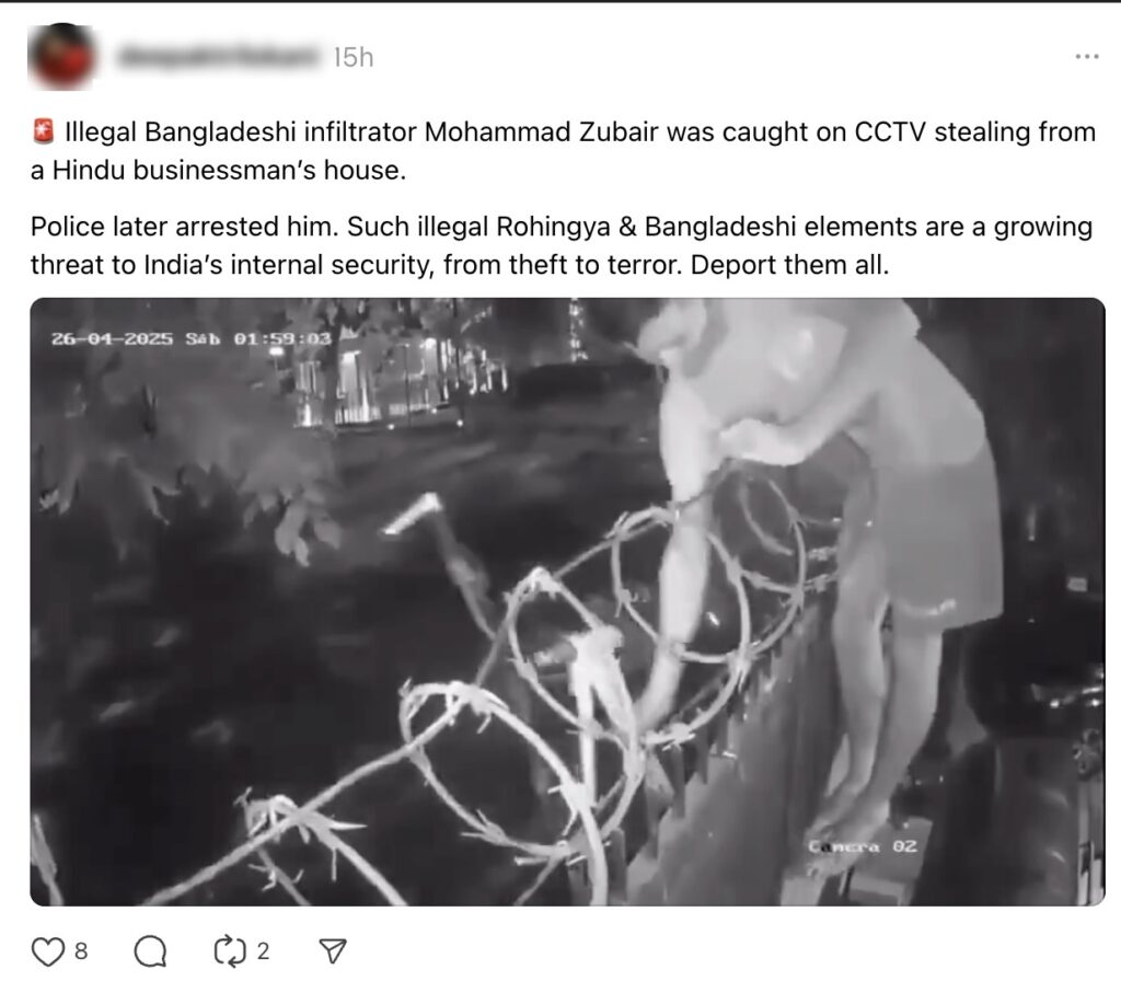 A CCTV video showing a man climbing over a wire fence and stealing a bicycle is circulating on social media, claiming that it depicts an illegal Bangladeshi infiltrator committing a burglary at a Hindu businessman’s home in India. Let’s investigate the truth behind this claim.