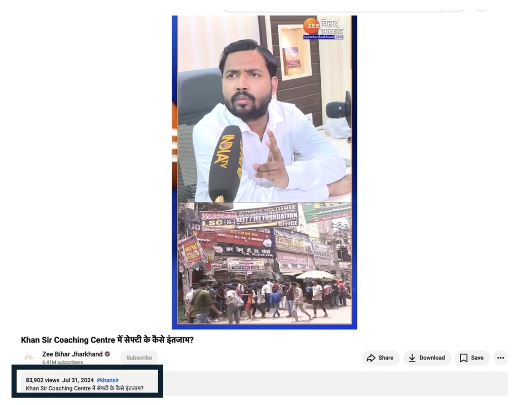 We then looked into clues visible in the video, such as the ‘Zee Jharkhand-Bihar’ watermark. A search using this reference led us to the original video uploaded by Zee Jharkhand-Bihar on 31 July 2024, months before the Bihar election results were announced in November 2025. The background and Khan Sir’s attire in the original clip match perfectly, confirming it as the source of the clip.